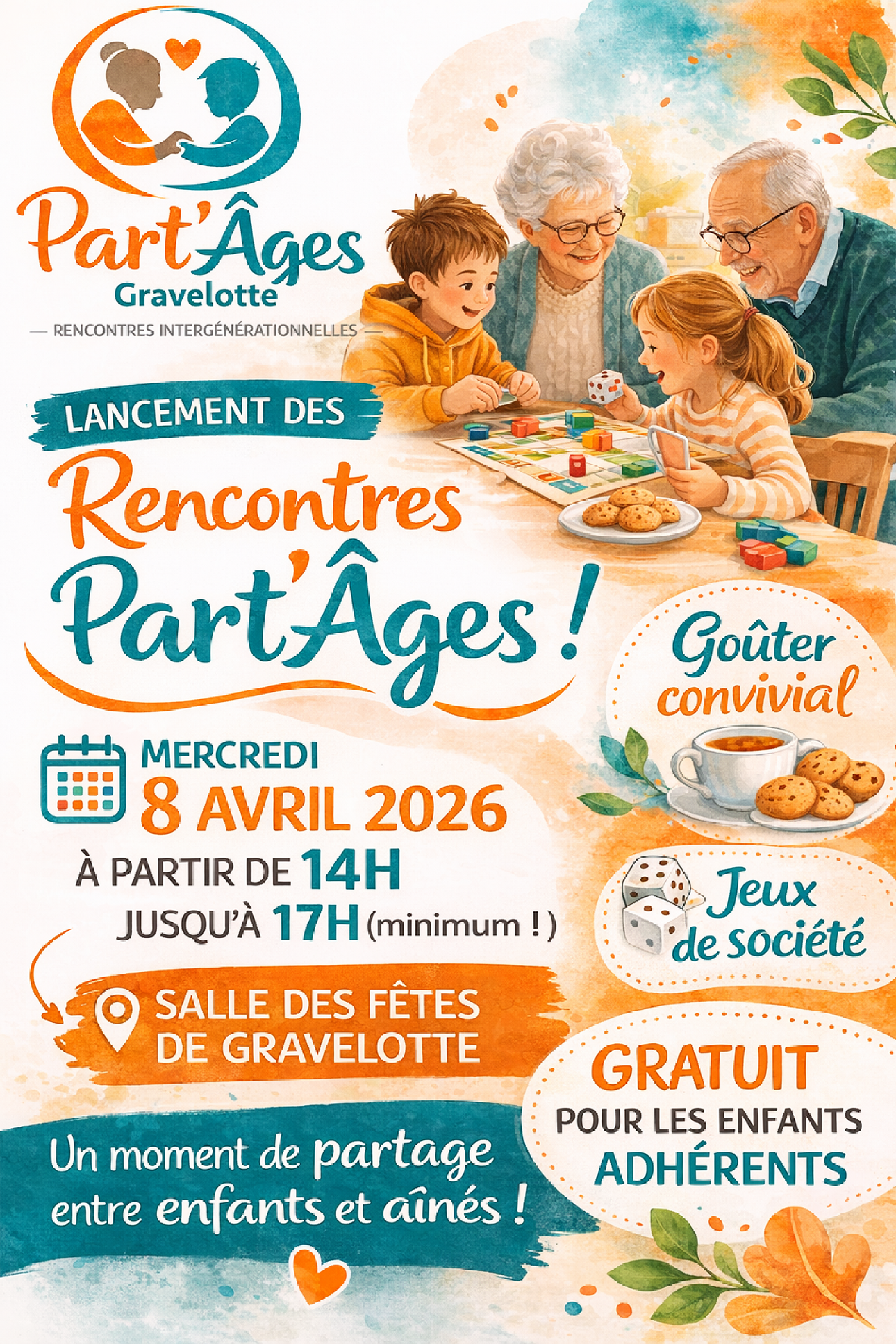 Ce temps convivial sera l’occasion de découvrir les objectifs et les actions du projet Part’Âges, ainsi que de partager un moment chaleureux autour d’activités intergénérationnelles (jeux, échanges, goûter…).