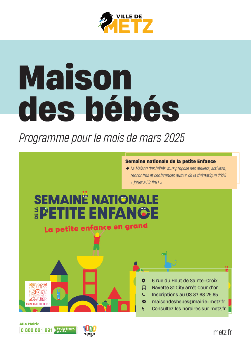 Dans le cadre de la CTG, nous vous partageons le nouveau programme de la Maison des bébés pour les mois de janvier à mars. Plus d’info : https://metz.fr/lieux/lieu-4419.php